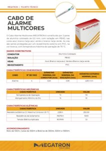 O Cabo Alarme Multicores Megatron é constituído por 2 pares de alumínio cobreado de 0,5 mm, com isolação em PEAD, nas cores azul, branco tarja azul, verde e branco tarja verde. As vias são sendo protegidas por um revestimento externo em PVC, na cor branca, com temperatura máxima de operação de 70 °C.