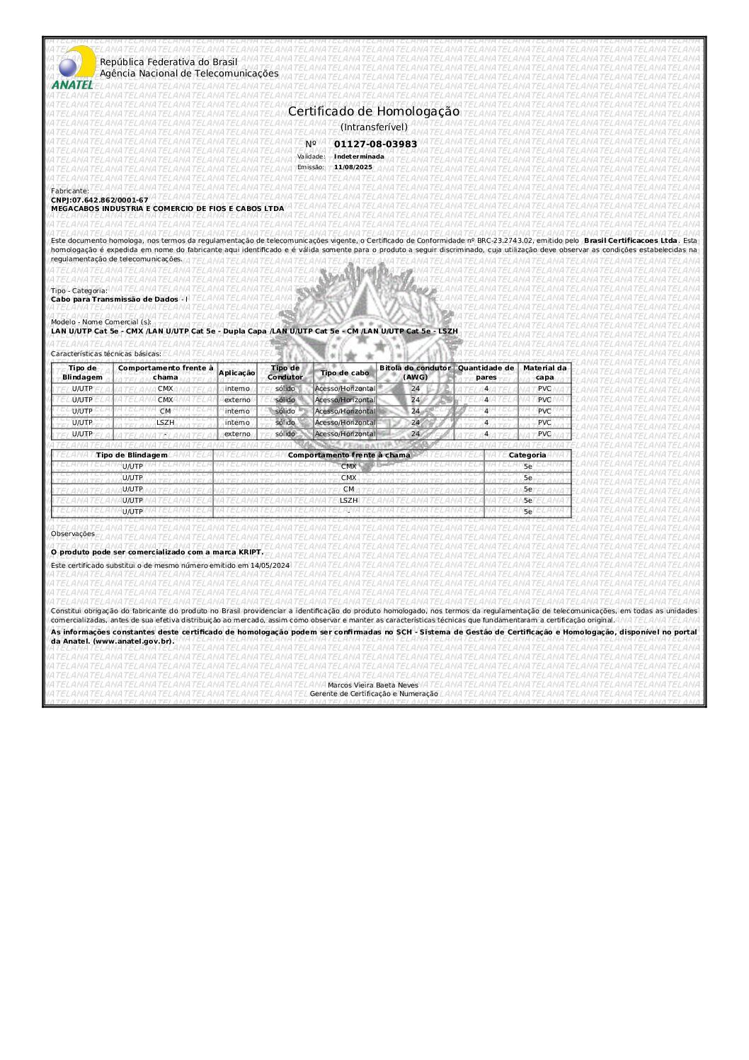 | ESPECIFICAÇÕES APLICÁVEIS | ANSI/TIA– 568.2-D, ABNT NBR 14703, ABNT NBR 14705, UL 444, ISO/IEC 11801, Atende a NBR 14565, NBR 16521 e NBR 16264 |