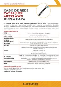 O Cabo de Rede CAT6 Dupla Capa da Megatron é a escolha ideal para instalações que exigem alto desempenho, robustez e conformidade total com as normas. Com condutor de cobre sólido eletrolítico 23 AWG, oferece excelente condutividade e integridade de sinal. Sua isolação em polietileno de alta densidade (PEAD) reduz interferências internas, enquanto a cobertura externa em dupla capa garante proteção extra contra agressões mecânicas e ambientais.