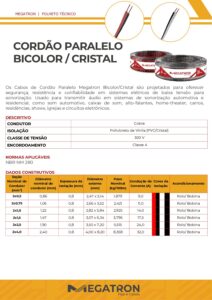 Os Cabos de Cordão Paralelo Megatron Bicolor/Cristal são projetados para oferecer segurança, resistência e confiabilidade em sistemas elétricos de baixa tensão para sonorização. Usado para transmitir áudio em sistemas de sonorização automotiva e residencial, como som automotivo, caixas de som, alto-falantes, home-theater, carros, residências, shows, igrejas e circuitos eletrônicos.