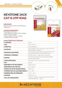 Projetado para ambientes de alto desempenho, o Keystone RJ45 CAT6 da Megatron entrega qualidade e robustez para aplicações críticas. Tipo U/UTP, fêmea 90°, com 8 vias, sua estrutura em termoplástico antichamas (UL 94V-0) e ABS de uso interno garante resistência e longevidade. Os terminais possuem revestimento estanhado com área de contato banhada a ouro, assegurando transmissões estáveis. A conexão traseira padrão IDC 110 aceita cabos sólidos de 22 a 26 AWG. Suporta velocidades de até 1000 Mbps, atendendo rigorosamente às normas ANSI/TIA/EIA-568-A/B, RoHS, ISO 9001, IEC 11801 e aplicação conforme NBR 14565.